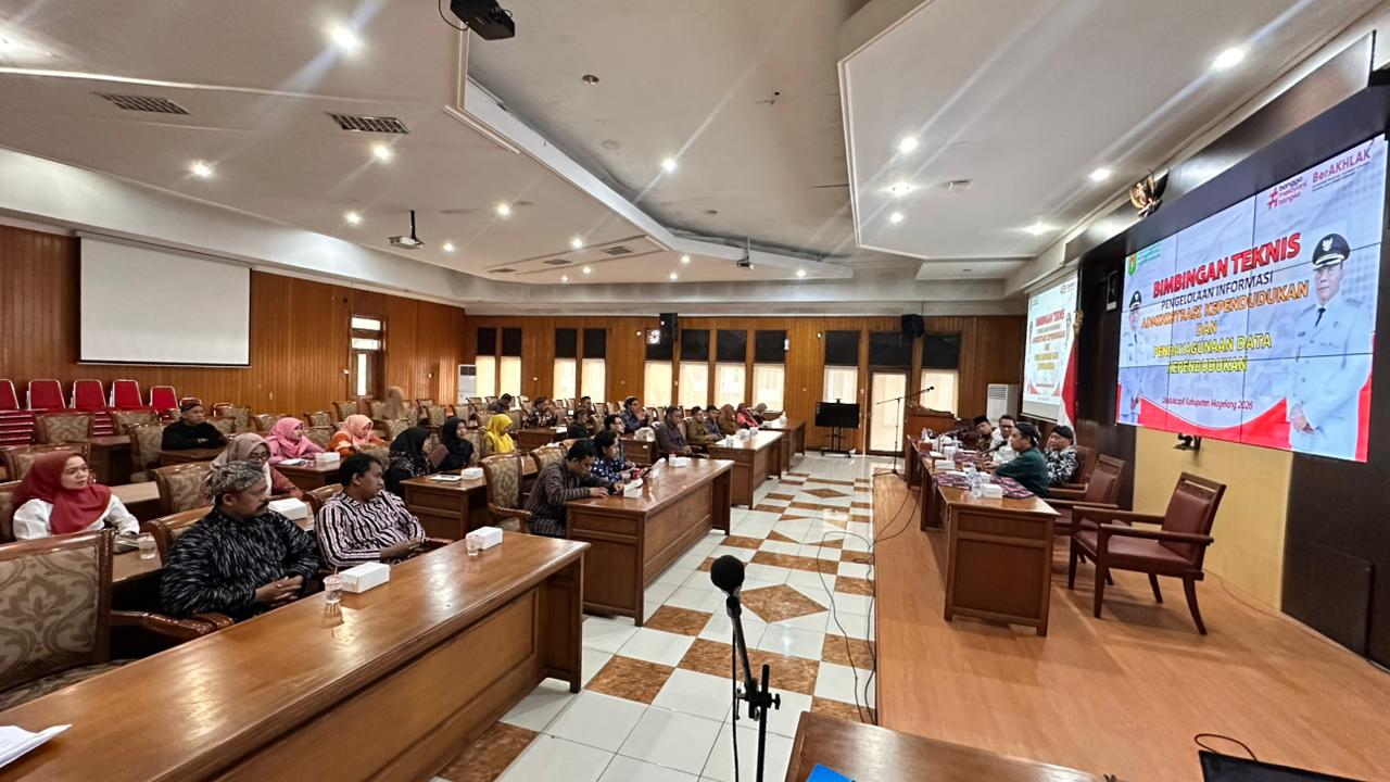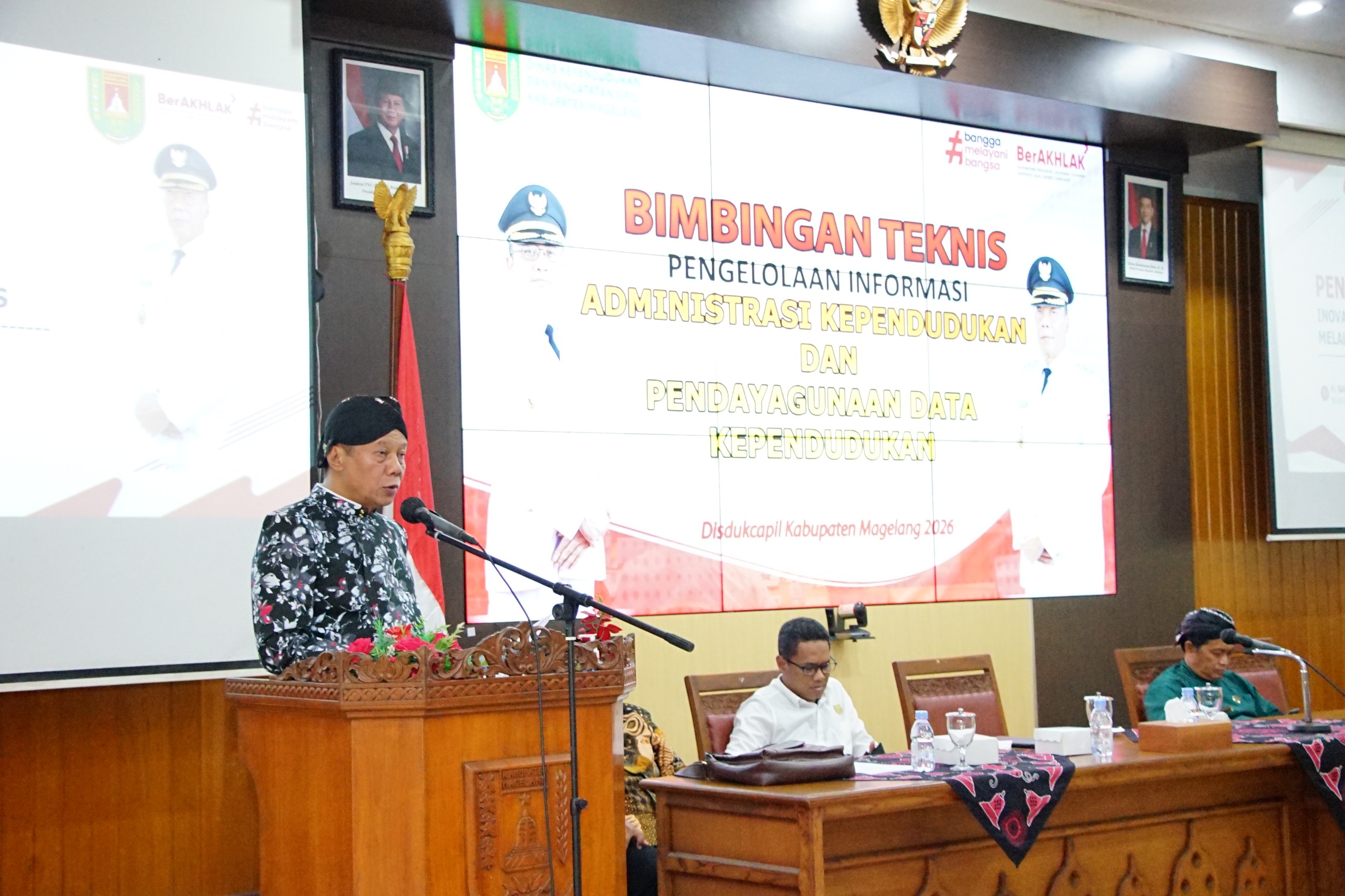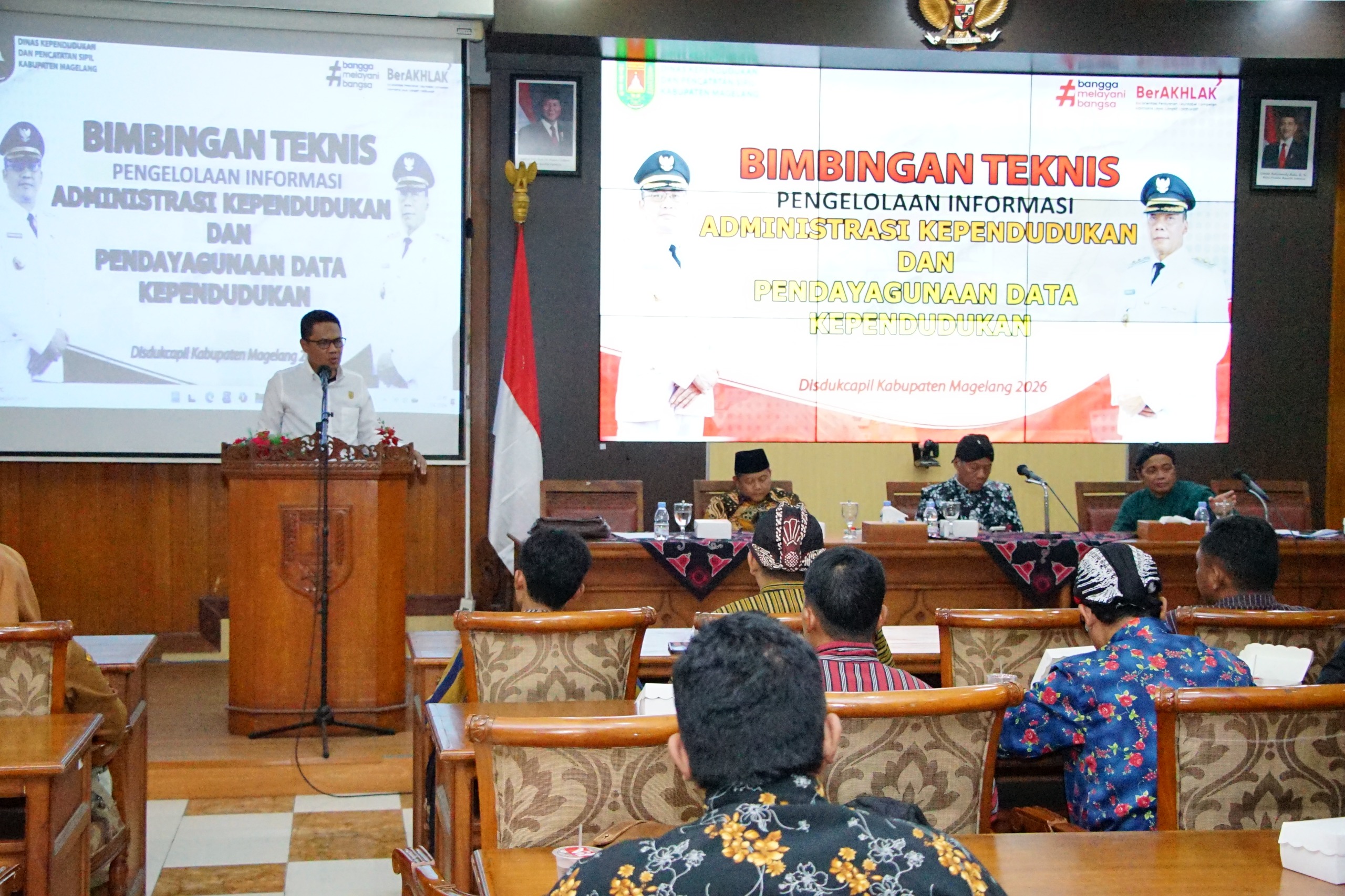 Pemerintah Kabupaten Magelang melalui Dinas Kependudukan dan Pencatatan Sipil (Disdukcapil) menggelar Bimbingan Teknis (Bimtek) Pengelolaan Informasi Administrasi Kependudukan dan Pendayagunaan Data di Ruang Bina Karya Kompleks Setda Kabupaten Magelang, Selasa (21/4/2026).