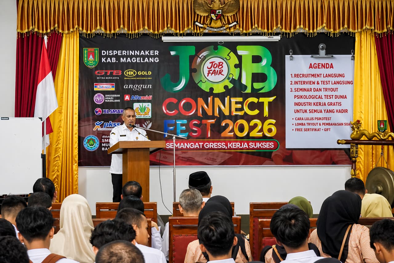 Pemerintah Kabupaten Magelang terus mendorong penyerapan tenaga kerja melalui penyelenggaraan Job Connect Fest 2026 yang digelar di Kantor Kecamatan Mungkid, Rabu (22/4/2026).