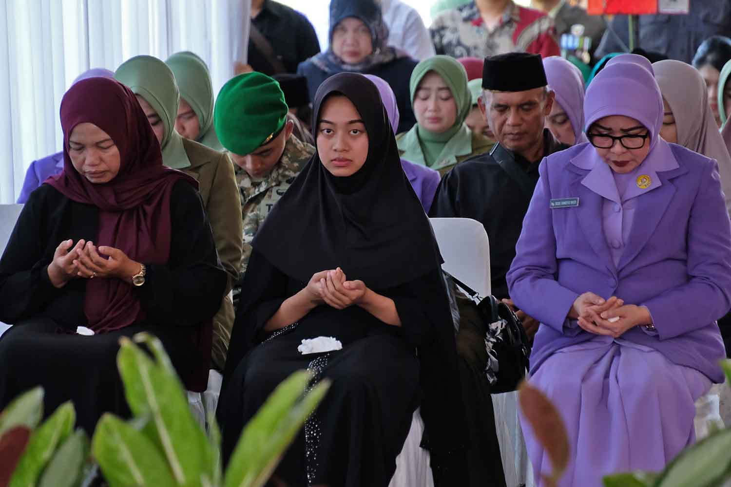 Istri Sertu Nur Ichwan, Hana Dita Anjani (tengah) berdoa saat menghadiri pemakaman sang suami tercinta.