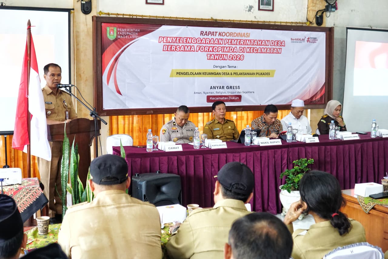 Pemerintah Kabupaten Magelang menegaskan pentingnya pengelolaan keuangan desa yang transparan dan akuntabel dalam Rapat Koordinasi Penyelenggaraan Pemerintahan Desa bersama Forkopimda di Aula Kecamatan Dukun, Selasa (14/4/2026).