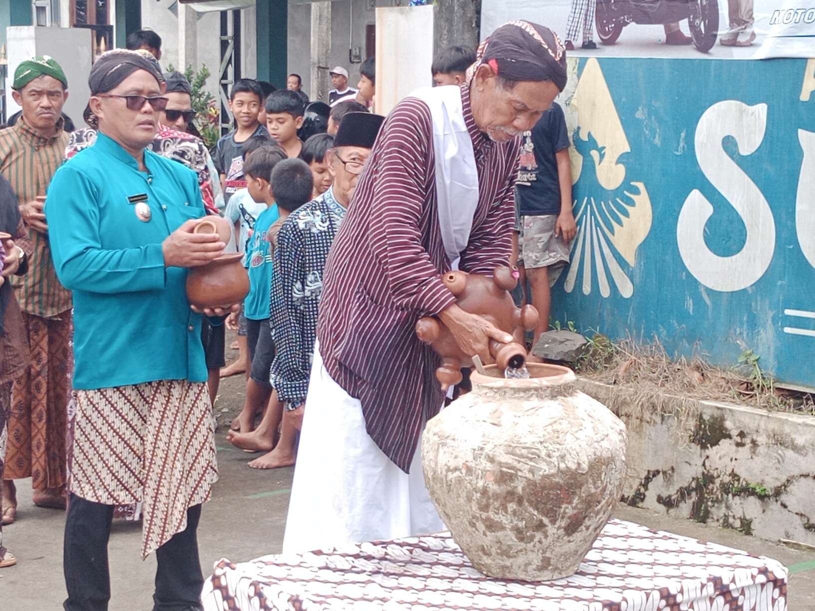 Tokoh masyarakat Desa Banjarnegoro menuangkan air dari sendang Dawung ke dalam gentong.