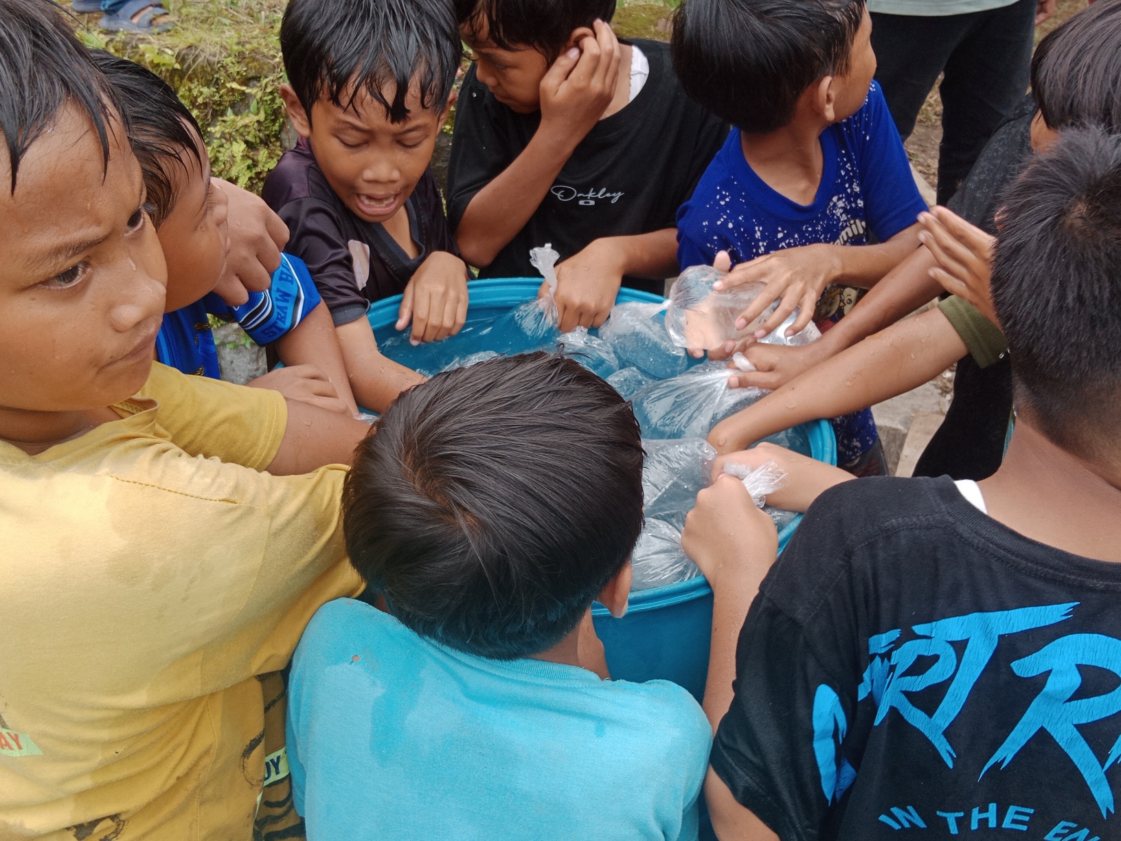 Anak-anak Desa Banjarnegoro siap-siap melempar air dalam tradisi Bajong Banyu.