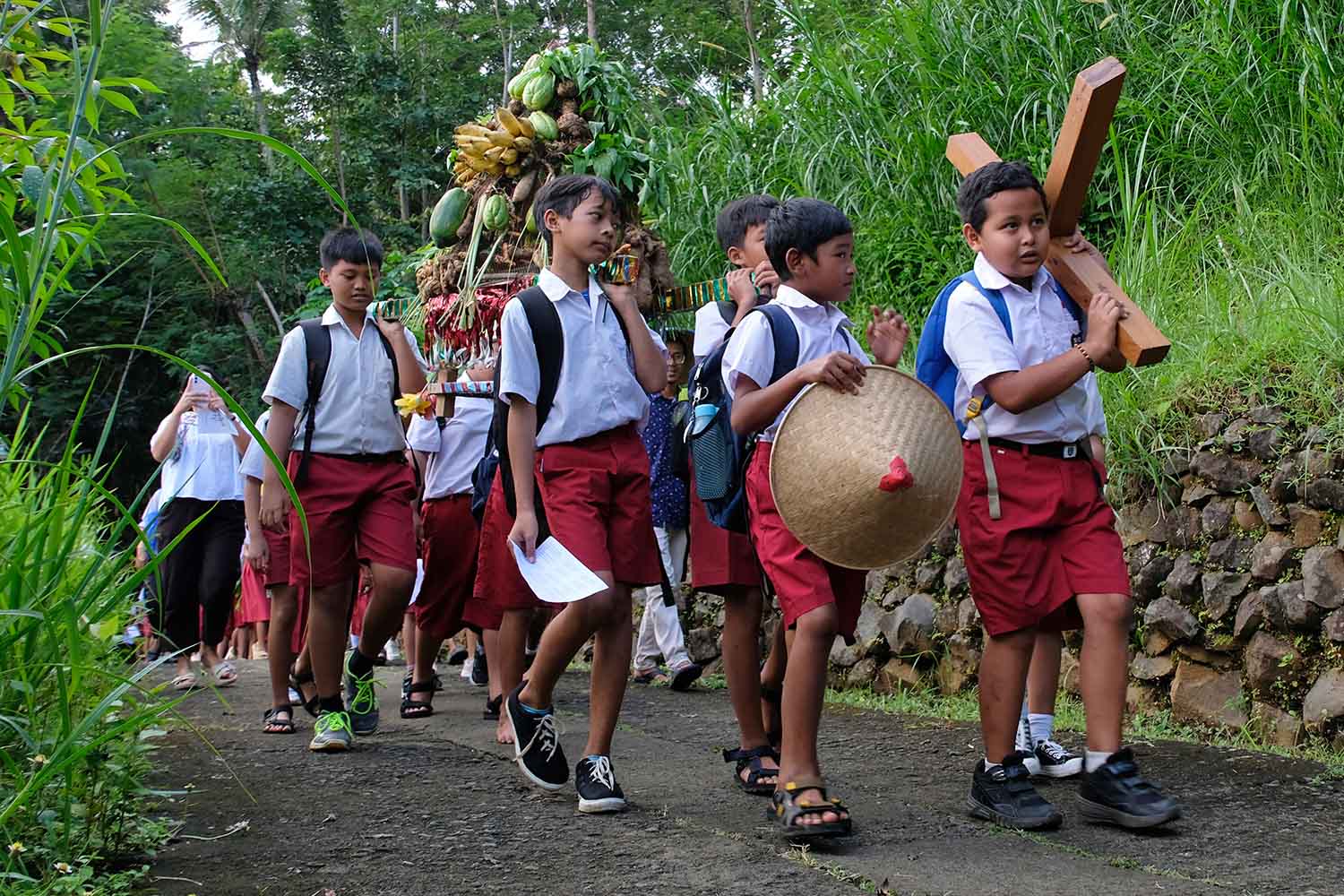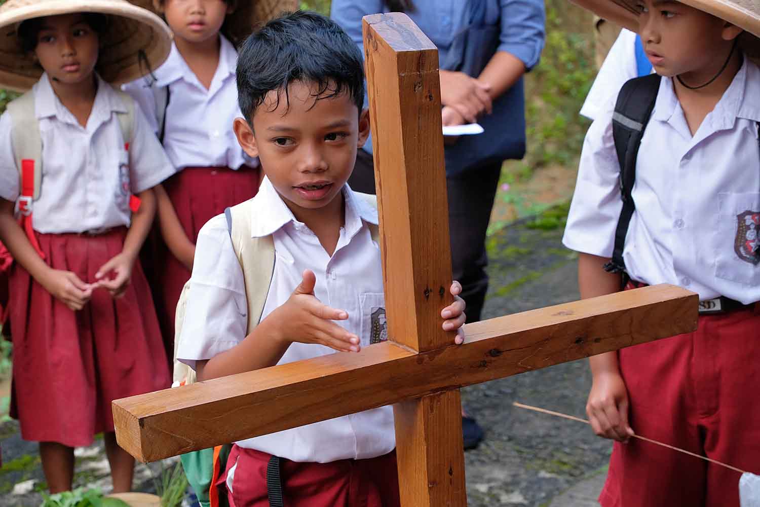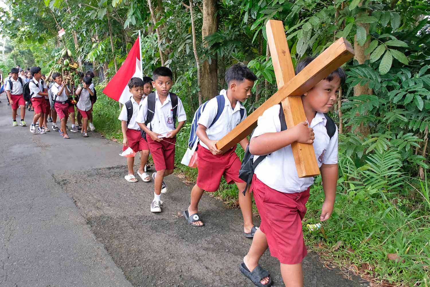 Meski harus menempuh perjalanan naik turun bukit sejauh empat kilometer, para pelajar penuh semangat mengikuti prosesi perjalanan sengsara Yesus Kristus.