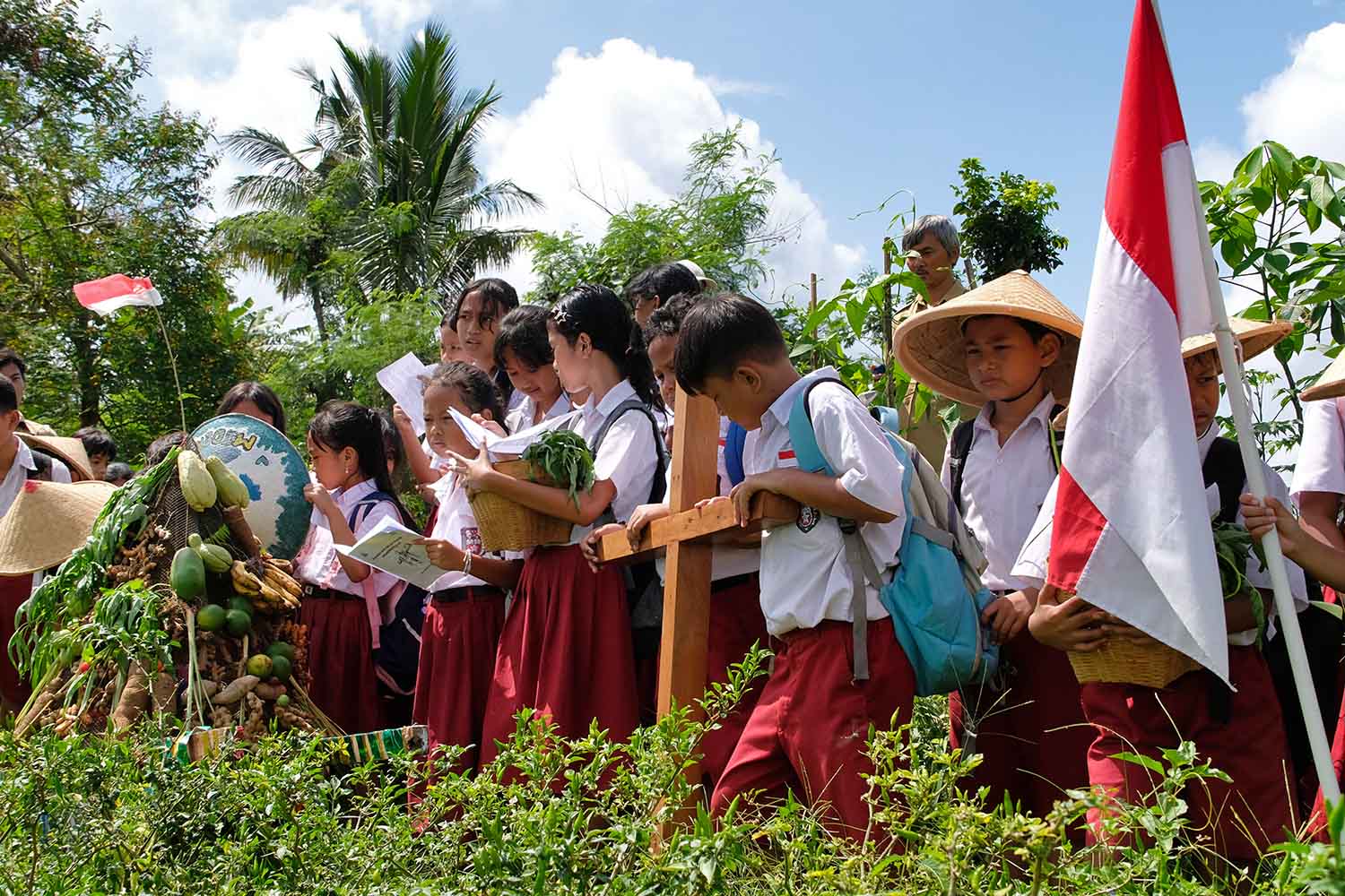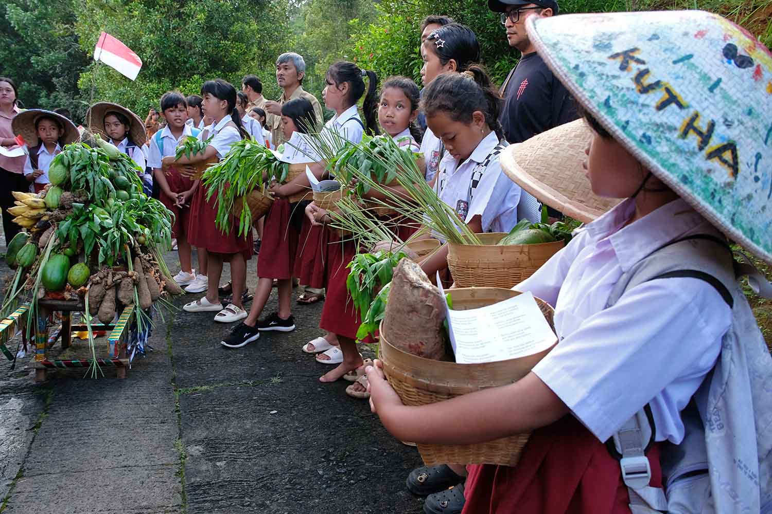 Selain memikul salib para pelajar juga mengusung gunungan hasil bumi berupa pala kependem maupun polo gumantung.