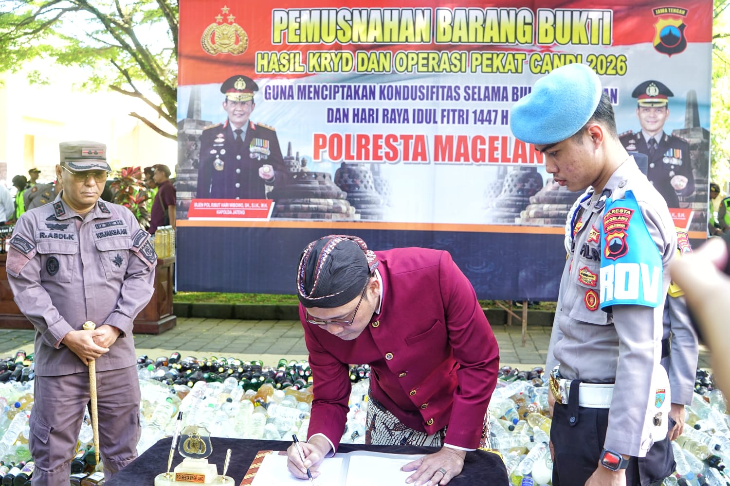 Polresta Magelang memusnahkan ribuan botol minuman keras (miras) berbagai jenis dan merek sebagai bagian dari upaya menjaga keamanan dan ketertiban masyarakat menjelang Ramadan dan Idul Fitri 1447 Hijriah.
