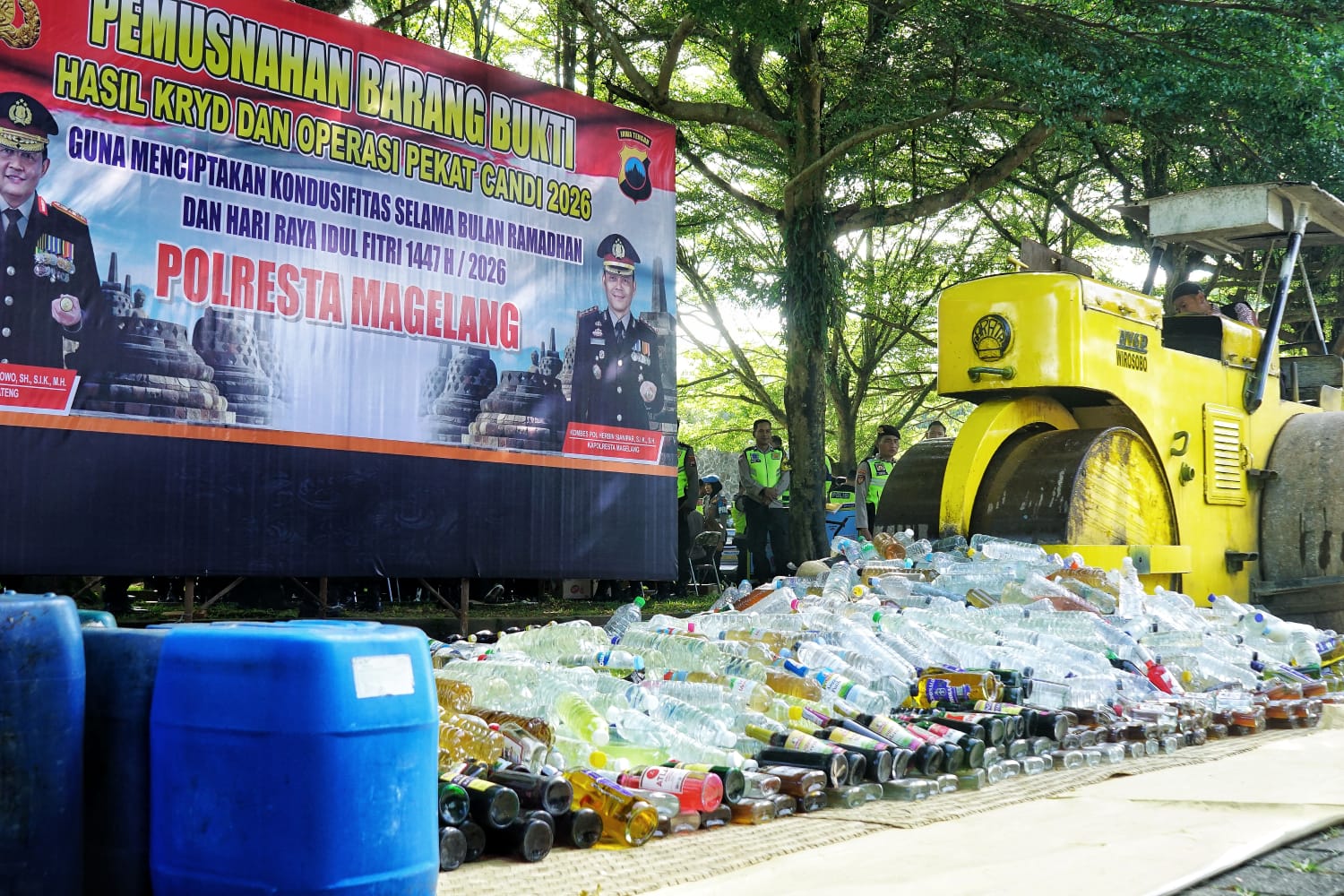 Dalam rangka memelihara situasi kamtibmas di Kabupaten Magelang selama periode Mei 2025 hingga Maret 2026 serta kegiatan yang ditingkatkan pada bulan Ramadan dan Hari Raya Idulfitri 1447 H, Polresta Magelang telah melaksanakan penindakan penyalahgunaan dan peredaran minuman beralkohol berbagai jenis sebanyak 4.257 botol dan 15 jerigen ciu.
